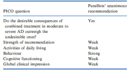 在第二輪的尋找共識(shí)過程之后,小組成員達(dá)成共識(shí)。各小組成員仍然同意第一輪的結(jié)果,與CHEI單一療法相比,所希望的CHEI和美金剛聯(lián)合治療效果超過在中重度AD患者身上的不良影響。但有一個(gè)例外存在著但也同意第一輪,總的贊成聯(lián)合治療的建議很弱。所有小組成員給ADL了一個(gè)弱推薦,但有兩個(gè)例外的行為強(qiáng)烈推薦以及認(rèn)知的一個(gè)弱推薦和GCI的三個(gè)例外弱推薦。在第二輪小組成員都同意推薦并贊成合并CHEI加美金剛治療總結(jié)于表2中。