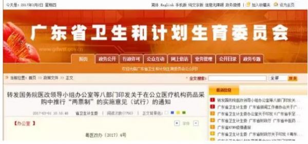 3月2日,廣東省衛(wèi)計委官網(wǎng)轉(zhuǎn)發(fā)《國務(wù)院醫(yī)改領(lǐng)導(dǎo)小組辦公室等八部門印發(fā)關(guān)于在公立醫(yī)療機構(gòu)藥品采購中推行“兩票制”的實施意見(試行)的通知》,這預(yù)示著,醫(yī)藥大省廣東啟動兩票制的步伐在加速。