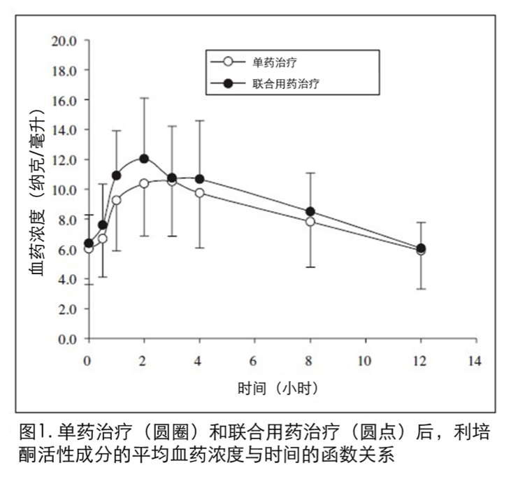 圖1和圖2所示分別是利培酮活性成分和多奈哌齊的平均血藥濃度與時間的函數(shù)關(guān)系。在單藥治療周期,利培酮活性成分的平均血藥濃度為6.3±2.7納克/毫升(第7天)、6.5±2.9納克/毫升(第11天)、 6.4±2.9納克/毫升(第12天)、6.5±2.6納克/毫升(第13天);在聯(lián)合用藥治療周期,利培酮活性成分的平均血藥濃度為6.2±2.5納克/毫升(第7天)、6.7±3.2納克/毫升(第11天)、6.2±2.2納克/毫升(第12天)、6.8±2.5納克/毫升(第13天);上述數(shù)據(jù)表明活性成分在第7天達(dá)到穩(wěn)定狀態(tài)。在單藥治療周期,多奈哌齊的平均血藥濃度為12.0±2.6(第7天)、14.5±3.3(第11天)、14.8±3.5(第12天)、14.9±3.1(第13天);在聯(lián)合用藥治療周期,多奈哌齊的平均血藥濃度為12.0±3.1(第7天)、13.9±4.3(第11天)、14.1±3.7(第12天)、14.6±3.9(第13天);以上平均數(shù)據(jù)表明多奈哌齊在第11天達(dá)到穩(wěn)定狀態(tài)。利培酮活性成分的血藥濃度在單藥治療和聯(lián)合用藥治療周期分別于2.4時和1.9時達(dá)到峰值。而多奈哌齊的血藥濃度在單藥治療和聯(lián)合用藥治療周期分別于3.7時和4.1時達(dá)到峰值。藥代動力學(xué)參數(shù)的最小二乘均值和相對生物藥效率見表1。利培酮在AUC0-τ、Cmax、Cmin的治療比率(聯(lián)合治療/單藥治療)和相關(guān)的90%的置信區(qū)間分別為114.7%(90% CI = 102.9-127.8)、120.5%(90%CI = 106.6-136.4)、104.8%(90%CI =91.0-120.7)。AUC0-τ和Cmax的90%置信區(qū)間上限超出了生物藥效率的上限值125%。這種置信區(qū)間上移的情況,加上利培酮單藥治療和聯(lián)合治療的治療比率,表明與多奈哌齊的聯(lián)合用藥有可能會略微減少藥物代謝(利培酮-9-羥基-利培酮除外)并/或略微增加利培酮的吸收。然而,利培酮活性成分的治療比率和相關(guān)的90%置信區(qū)間(AUC:110.2%和103.7-117.2;Cmax:114.6%和107.0-122.8)在80%到125%范圍內(nèi),表明利培酮藥物代謝及吸收上的變化并沒有顯著影響利培酮活性成分的相關(guān)生物藥效率,而利培酮活性成分是利培酮藥物與臨床治療最相關(guān)的成分。多奈哌齊的治療比率和相關(guān)的90%置信區(qū)間的所有參數(shù)都在90%到107%之間,均在80%-125%范圍內(nèi)。因此,多奈哌齊單藥治療和聯(lián)合治療之間沒有顯著的藥代動力學(xué)參數(shù)區(qū)別。上述結(jié)果表明,本試驗研究的每日1毫克利培酮和每日5毫克多奈哌齊的聯(lián)合給藥方案未出現(xiàn)臨床意義的藥物相互作用。