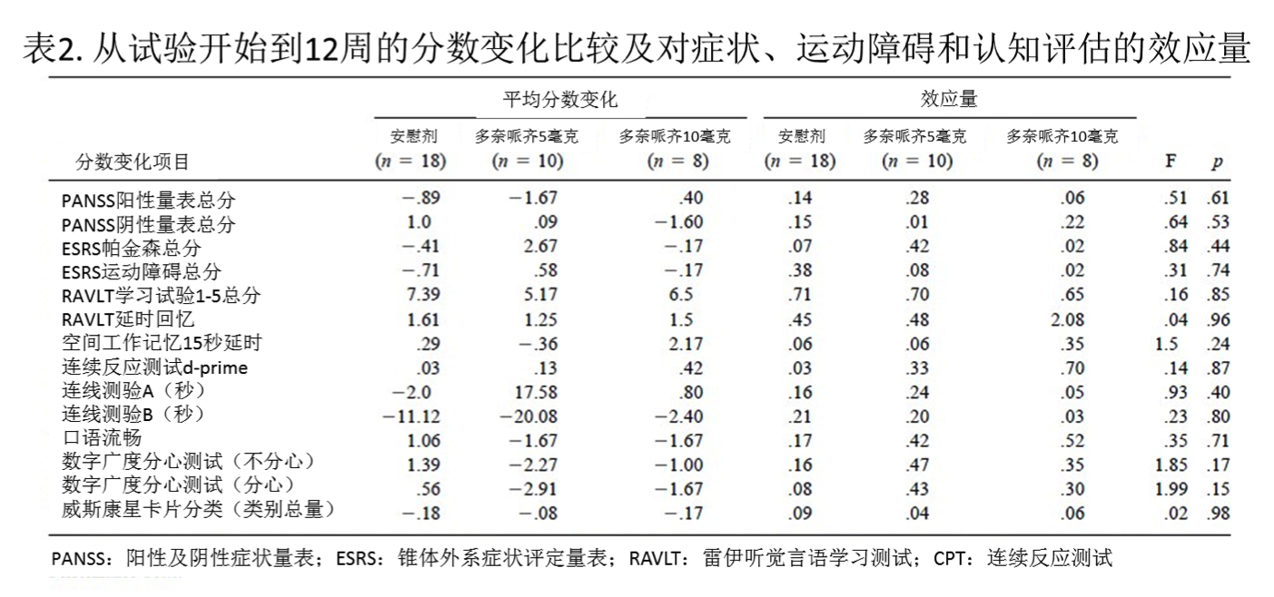 鑒于一些文獻資料有證據(jù)表明類膽堿藥物可能對精神分裂癥癥狀(Edelstein等人,1981)和錐體外系癥狀(Caroff等人,2001)有治療效果,有研究對多奈哌齊在這些癥狀領域的治療效果也進行了探索和分析。多奈哌齊5毫克和10毫克治療與安慰劑治療相比,在PANSS陽性癥狀(F=1.74,df=101,p=.18)和陰性癥狀(F=.38,df=100,p=.68)的轉換中,并沒有顯著差異。另外,多奈哌齊治療和安慰劑治療在帕金森癥(F=.51,df=101,p=.6)與嚴重運動障礙(F=.01,df=101,p=.99)轉換的ESRS評定中也沒有顯著差異。在其他測試結果中也未見任何顯著差異(見表2總結)。