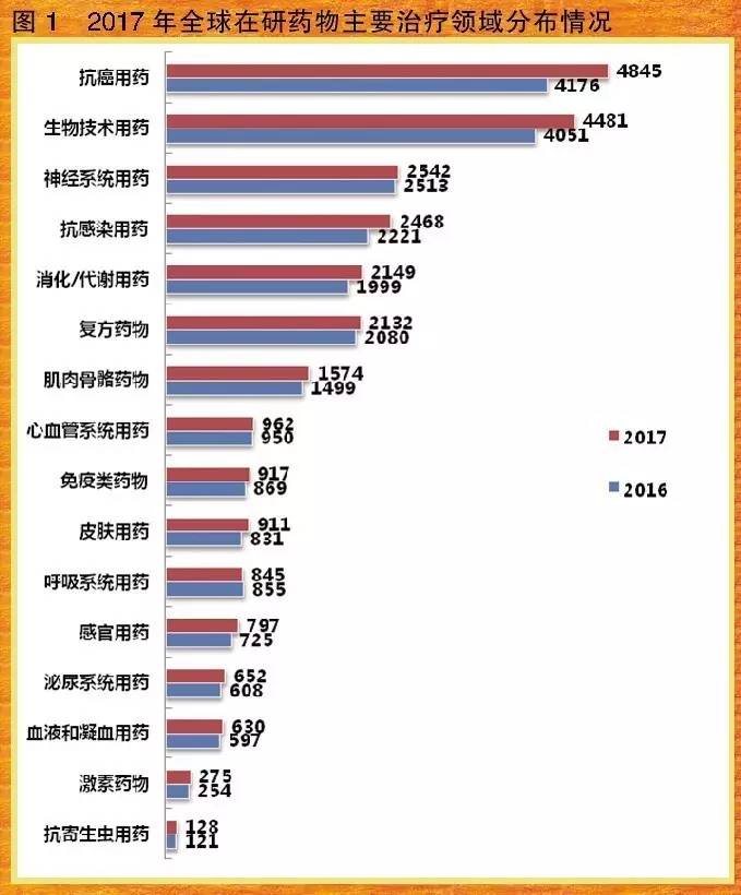 筆者對Pharmaprojects數(shù)據(jù)庫16個(gè)主要治療領(lǐng)域以及生物技術(shù)類別的在研藥物情況進(jìn)行分析發(fā)現(xiàn),除呼吸系統(tǒng)用藥外,2017年各治療領(lǐng)域的在研新藥數(shù)量均呈現(xiàn)增長態(tài)勢。