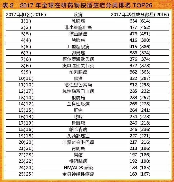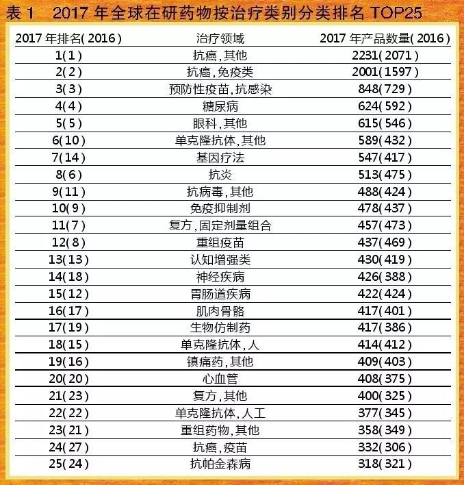 從治療類別TOP 25排名中發(fā)現(xiàn),一般抗癌藥(在研藥物2231個(gè))、免疫類抗癌藥(2001個(gè))、抗感染預(yù)防性疫苗(848個(gè))、糖尿病治療藥物(624個(gè))、其他眼科用藥(615個(gè))為排名居前五位的治療類別,該排名順序與2015和2016年順序一致。