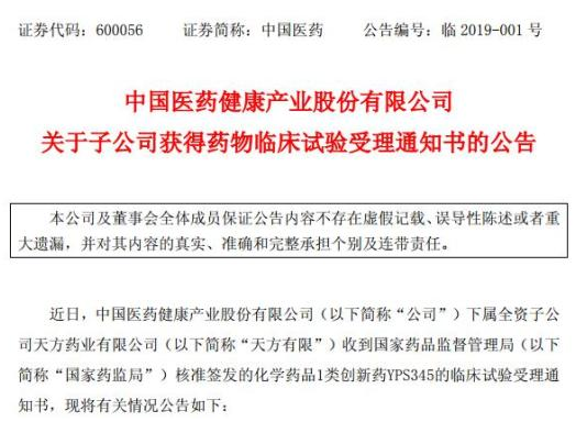 1月16日,中國醫(yī)藥發(fā)布公告稱,近日其下屬全資子公司天方藥業(yè)有限公司收到國家藥品監(jiān)督管理局核準(zhǔn)簽發(fā)的化學(xué)藥品1類創(chuàng)新藥YPS345的臨床試驗(yàn)受理通知書。截止公告日,天方有限在該類藥品研發(fā)項(xiàng)目上已累計(jì)投入約1,984萬元人民幣。
