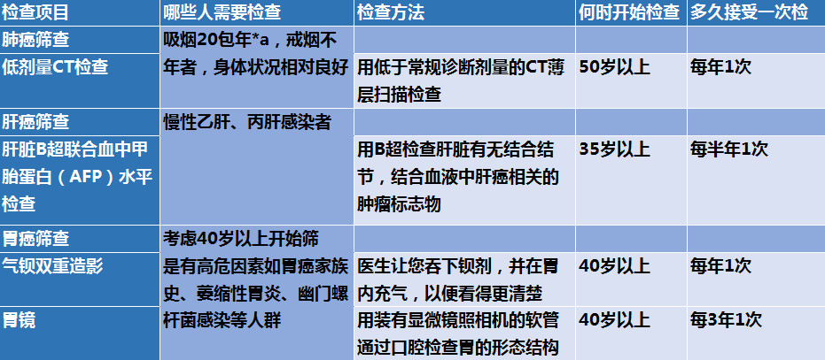 a.吸煙20包年是指每天吸煙包數(shù)乘以吸煙年數(shù),例如每天吸煙1包吸煙20年或每天吸煙2包吸煙10年都為吸煙20包年;肺癌的篩查推薦在74歲以后停止。