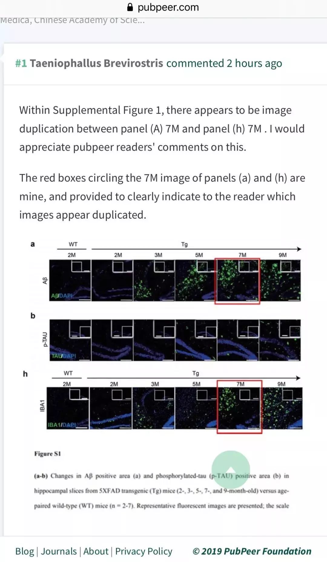 PubPeer是美國知名打假網(wǎng)站,鼓勵(lì)科研人員匿名對已發(fā)表的論文進(jìn)行評論?!吧虡I(yè)人物”在PubPeer搜索時(shí)發(fā)現(xiàn),耿美玉有五篇論文遭批,其中便包括這篇“小鼠實(shí)驗(yàn)”論文。質(zhì)疑聲出現(xiàn)在“九期一”獲得上市批準(zhǔn)不久,之后也有其他學(xué)者加入。