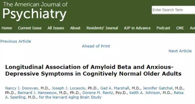 2.Donovan et al. "Longitudinal Association of Amyloid Beta and Anxious-Depressive Symptoms in Cognitively Normal Older Adults" The American Journal of Psychiatry.